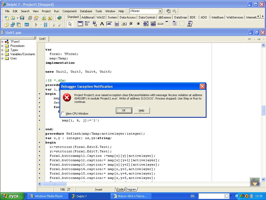 Как в тебя стока влезает-то! А если их всех в рантайме создать и потом Refresh немного упростить, т.е. прогнать всё в цикле. Подозреваю, у тебя глюки именно из-за такого нереального количества кнопок. позже добавлено: вот и ошибочка - массив-то нада по ссылке передавать! procedure initmap(x,y,z:integer; var map:Tmap); кроме того, у тебя при обновлении кнопок проиходит обращение к map[x+N,y+M,...] элементу. а если всего было 10 элементов, а x = 8, и N = 3? вот и обращение по индексу 11 - а его нету... Сообщение отредактировано: volvo - 2.11.2006 13:52 -------------------- ИзВ ин ИтЕ зА нЕ рОв НЫй П оч ЕРк