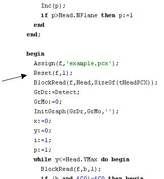 вообще ничего не понятно Rus1, тебе же дали информацию про pcx - какой же тут пример gif или bmp или jpeg? И объяснено все очень доступно.. Читай из файла побайтово. Каждый байт трактуй в соответствии с описанием. Или можешь сделать record для заголовка и параметров, и сразу считать ее всю, а потом брать поля. Для нахождения конца файла можешь использовать его длину.. Что еще? -------------------- я - ветер, я северный холодный ветер