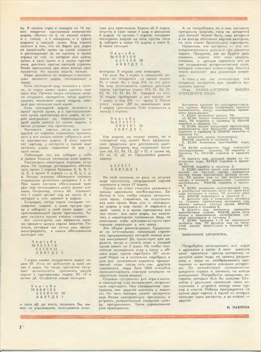 Популярная это всётаки игрушка Да, хорошая заметка)). Нет, я ее не видел (да и подход же совсем другой). В некий момент у нас на работе появились персоналки, Электроника НЦ-80 (копия DEC Pro 350). 8-битный проц, 512К памяти, Бейсик. Встал вопрос, на каком примере ее осваивать, и выбор пал на Калах (по соображениям, о которых я уже говорил не раз). Забавно, что это все происходило как раз примерно в момент выхода статьи. Надо еще сказать, что тогда в эту игру резались все программеры, поскольку существовала ее неплохая реализация (типа для БЭСМ). А еще, она тогда продавалась (не программная, а настольная). И была, кстати, значительно удобнее классического варианта (который описан в этой статье и широко продается сейчас тут, например). Там лунки были каждая отдельно, и не круглые, а камни одинаковые. Первое способствует легкости доставания шариков, а второе с третьим - легкости подсчета. Все это немаловажно, как выясняется в игре.Разложили игру по полочкам З.Ы. Просто предполагаю: Такие были времена.. Машина в миллионы (не преувеличиваю) раз слабее, и доступ к ним был сложнее. Но, вот, делали же и такие штуки)). -------------------- я - ветер, я северный холодный ветер