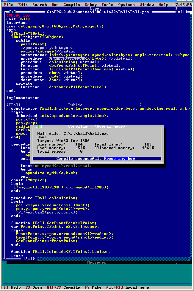 Цитата(Compiler Messages) ... уже недостаточно? Или на Warning-и не обращаем внимания? Ball.pas(11,19) Warning: An inherited method is hidden by "TBall.ChangeDirection(Byte, Double)" ... |