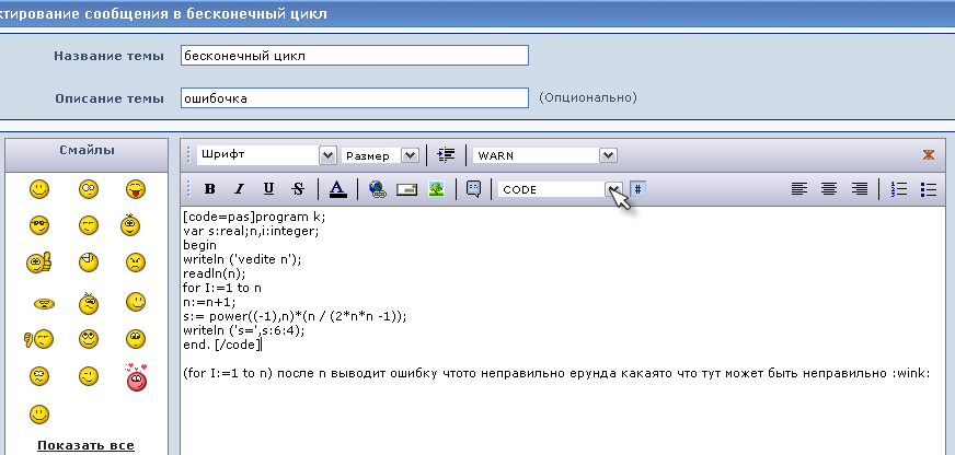 2. Все тексты программ должны помещаться в теги [code=pas] ... [/code].
