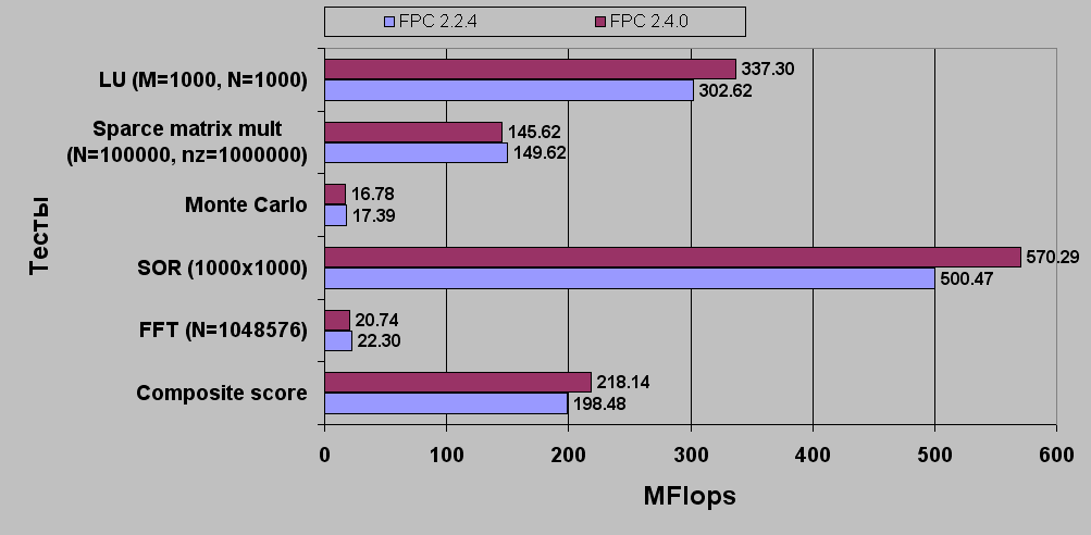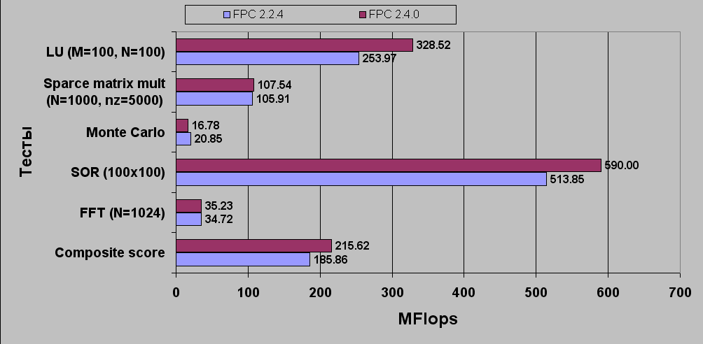 Все тесты проводились на одной и той же машине: Intel Core2 CPU 4400 @2GHz + 1024 Mb RAM, WinXP SP3. Настройки компиляторов: режим совместимости - Delphi, Range Checking (-), Stack Checking (+), I/O Checking (-), Integer Overflow Checking (+), генерировался быстрый код (generate faster code) для процессора Pentium4, Level 1 Optimization. Для начала запускаем обычный тест (без ключа -large, увеличивающего размер тестируемых структур): FPC 2.2.4 Composite Score: 185.86 FPC 2.4.0 Composite Score: 215.62 Теперь добавляем ключ -large, и тестируем еще раз: FPC 2.2.4 Composite Score: 198.48 FPC 2.4.0 Composite Score: 218.14 Итак, на синтетическом тесте новый компилятор более эффективно работает с плавающей точкой, чем предыдущий. Если у кого есть долго выполняющаяся программа (реальная, а не синтетическая) - давайте попробуем сравнить, как скорость ее выполнения изменилась при переходе на новый компилятор |