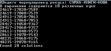Цитата МАМА+ПАПА+БРАТ+Я=СЕМЬЯ Даёт 24 различных решений. На досуге еще подумаю Код 3232+4242+7826+9=15309 3232+4242+9826+5=17305 3535+7575+8250+4=19364 3535+8585+4250+9=16379 3535+9595+4250+6=17386 3636+4646+9068+2=17352 3838+7878+9584+6=21306 4242+3232+7926+8=15408 5252+9292+4026+3=18573 6161+9191+5318+4=20674 6565+9595+7450+8=23618 7373+5353+9034+8=21768 7373+8383+6034+5=21795 7878+6868+5984+1=20731 8383+7373+5134+6=20896 8585+2525+3750+9=14869 9191+4141+7618+3=20953 9494+3434+6042+5=18975 9595+2525+4850+3=16973 9595+6565+8750+3=24913 9595+8585+6750+1=24931 9696+3636+4568+2=17902 9696+7676+3568+1=20941 9898+7878+3184+5=20965 found 24 solutions Сообщение отредактировано: Сергей Меркурьев - 11.01.2011 12:47 -------------------- ♣♣♣