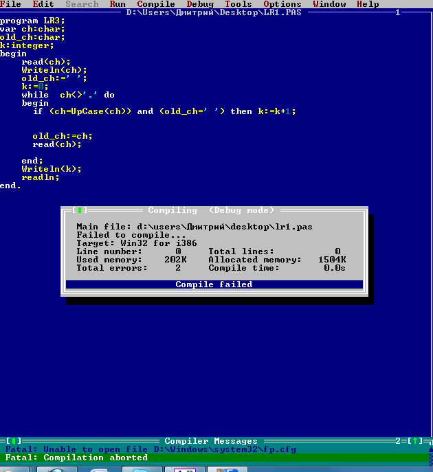 Выйди из IDE, удали (или переименуй) этот FP.CFG из D:\Windows\System, и заново запусти FPC. Лучше всего - ярлыком, в котором прописана рабочая папка. Да, и в качестве рабочей выбери папке БЕЗ кириллицы в пути, а? Тысячу раз говорено об этом уже. При запуске FPC должен проверить, есть ли в этой рабочей папке CFG-файл, и, поскольку его там нет, будет выведено соответствующее сообщение ("в этой папке FPC ни разу не запускался", что-то в этом духе) и FP.CFG будет создан заново. P.S. А перед этим не было сообщения "Illegal parameter: -Opentium3"? Это тоже может быть причиной подобного поведения. |