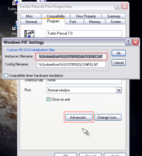 Цитата(Афина @ 5.06.05 21:09) У меня нет файла autoexec.bat, подскажи как его установить. Посмотри на картинку в аттаче. Найди ярлык, которым запускается Паскаль, перейди на вкладку "Program" и нажми там на кнопку "Advanced". В появившемся окне (там где отмечено) - путь к AutoExec. Или редактируй тот файл, или скопируй его в другое место и новый путь пропиши в этом окошке... Эскизы прикрепленных изображений ![]() |