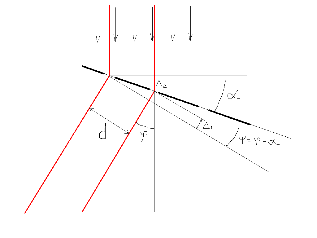 Я кажется опоздал, но может будет полезно.. 1. При перпендикулярном (к оси пучка) расположении решетки угол на максимум порядка m рассчитывается из простых геометрических соображений: угол отклонени луча должен быть таким, чтобы разность хода равнялась целому числу волн. Разность хода равна произведению постоянной решетки d на синус угла отклонения луча ф (вместо греческой "фи"). Длину волны обозначаю Л (типа греческая "ламбда"). d*sin(ф) = m*Л 2. Если решетка составляет с осью пучка угол а (альфа), то вычисления лишь немного усложняются. Теперь разность хода состоит из двух кусков: Д1 (дельта один) и Д2. Оба они легко находятся. Их сумма снова должна быть равна m*Л. Получаем: Д1 + Д2 = d*sin(ф-а) + d*sin(a) = m*Л Что касается вопроса про зрительную трубу, то все оптические длины от вхождения параллельных лучей в трубу до собирантия их в фокальной плоскости равны между собой (согласно принципу наикратчайшего пути, не помню, чьего он имени). Заходи почаще и вопросы задавай пораньше.. я прихожу не раньше полуночи.. Успехов! -------------------- я - ветер, я северный холодный ветер