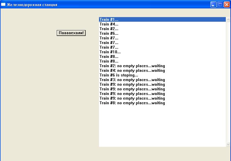 есть станция, для неё предусмотрено n-е количество мест для стоянки проходящих поездов (для определённости - 3 места, например, для реализации этой идеи использовать семафор с максимальным количеством ресурсов=3). Если все места заняты - поезд (это будет поток) должен ожидать освобождения места для стоянки (т.е. поезд на время ожидания засыпает). Главная цель - не пропустить поезд на станцию, если там нет свободных мест. Для поезда, который занял своё место на станции - его время простоя должно определяться по закону (экспоненциальному наверное - с тем смыслом, что чем дольше поезд простоял, тем выше вероятность, что скоро он отправится дальше и освободит место стоянки) Потоки-поезда должны генерироваться по з-ну Пуассона. Выходные данные: думаю представить статистику по простоям и по ожиданию освобождения места.. Пока не представляю себе, как должна выглядеть генерация потока-поезда по Пуассону.. тоже самое с временем простоя на станции...не знаю, как поезда-поток "заставить" остаться там на некоторое время (тоже определяемое по закону).. Пока решила начать с того, что по рандому создавать поезда-потоки, в функции потока в зависимости от состояния семафора записывать на listbox идентификатор поезд и его состояние..Вот только выводятся поезда как попало...Даже не знаю, в чём причина может быть.. А вообще хочу представить движение-остановку поездов-потоков в виде передвижения-застывания label с каким-нибудь текстом..