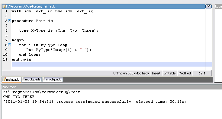 Цитата А вместо диапазона писать название перечислимого типа можно? Легко... Будет перебираться весь тип, от самого первого до самого последнего значения, и всего делов. Обрати внимание, для того чтобы напечатать идентификатор элемента, достаточно сделать MyType'Image. Это тоже встроено в язык, не нужны никакие Дельфийские шаманства с RTTI. Цитата А, контроль вариантных полей во время выполнения (во время компиляции, увы, никак). Увы - это ты про Дельфи? (правда тут у тебя небольшой облом - селектор должен задаваться один раз, при инициализации переменной. Менять его ты не имеешь права. Задавать переменную без селектора - тоже). Но как доп. средство для контроля - пойдет. |