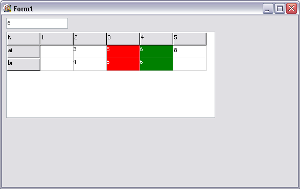 Цитата если сделать так, будет неправильно? Нет...Смотри. Событие OnDrawCell происходит при перерисовке каждой клетки. То есть, когда ты рисуешь одну клетку, тебе нужно всего навсего проверить ту, которая выше или ниже нее, одинаковый ли текст они содержат: procedure TForm1.SGDrawCell(Sender: TObject; ACol, ARow: Integer; Rect: TRect; Вот. А теперь - еще кое что: как только ты вводишь информацию в ячейку, тебе надо перекрасить таблицу: во-первых, возможно, пары одинаковых значений больше нет, а во-вторых, максимум мог измениться. Что для этого надо? Я сделал обраотчик события OnSelEditText у грида: procedure TForm1.SGSetEditText(Sender: TObject; ACol, ARow: Integer; Вот в этом же самом событии, OnSelEditText, я бы и находил максимум, индекс макс. элемента, запоминал бы его в переменной, описанной в классе формы (не надо злоупотреблять глобальными переменными, лучше работать с членами класса), а в OnDrawCell добавил бы еще одну проверку: если сейчас рисуется ячейка, индекс ACol которой совпадает с индексом максимума - то рисовать ее не белым и не красным, а, скажем, зеленым... Попробуй это реализовать сам, если что не получится - я помогу. |