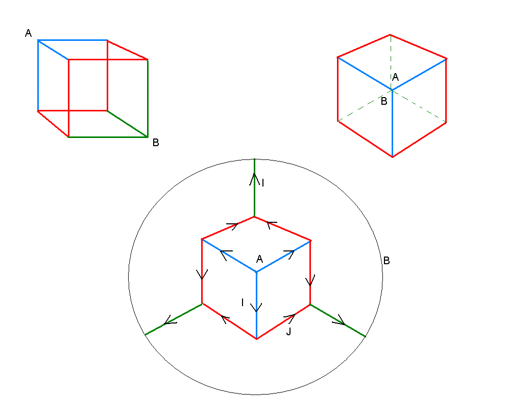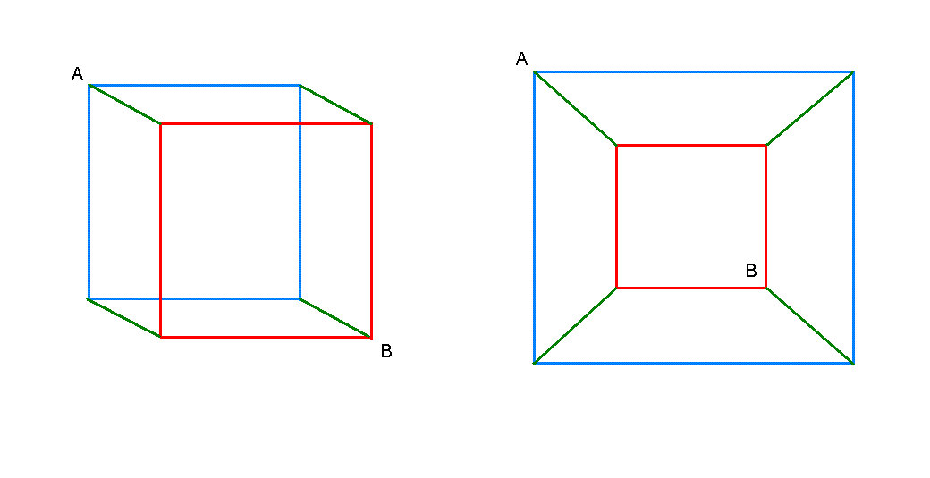 не понятно, как этот куб перестроить в обычную схему (эл.цепь)? Ты имеешь в виду плоскую схему? Это можно сделать многими разными способами. Например, как на этом рисунке: Цвета тут поясняют, что есть что. Но только пользы от такой схемы не очень много.. Мы умеем рассчитывать последовательные сопротивления, параллельные.. а тут - нечто совершенно другое, странное.. На ум приходит, что нужно как-то воспользоваться симметрией куба. Но как? У куба огромное количество всяких симметрий - какую из них выбрать? Давайте посмотрим.. Сопротивление - это характеристика прохождения тока. Давайте проследим, как ток идет от точки А к точке В. Мы видим, что, выходя из точки А он сразу же делится на 3 части. Соответствующие ребра на рисунке (см. ниже) - синие. В точку В он приходит с трех разных направлений (зеленые ребра). Все остальные ребра обозначим красным цветом. Если просто переориентировать куб (повернуть), то мы получим картинку справа вверху. А теперь разрвем соединение в точке В и вывернем зеленые ребра наружу, а потом соединим снова проволокой, у которой сопротивление нулевое, размазав тем самым точку В по всей черной окружности (нижняя схема на рисунке). Вот с этой схемой теперь попробуем разобраться.. Схема получилась вполне симметричная. Ток выходит из точки А. Очевидно, что все три синих тока равны между собой. Назовем их I. Далее каждый из этих токов раздваивается. При этом, конечно, на равные части (тоже следствие симметрии). Назовем красные токи J. Можно записать, что I=2*J. Направления протекания каждого тока я пометил стрелками. После протекания по красным ребрам, ток снова сливается в три потока (зеленые ребра), равных между собой. Вот такая картина токов. Как ее использовать для нашей цели? Синий ток, как я уже сказал, раделяется на два. Попробуем представить синий провод сразу двойным. По одному течет одна половина тока, которая пойдет направо, а по другому - другая, которая пойдет налево. Это можно осуществить и в реальности. Для этого нужно заменить сопротивление, соответствующее одному ребру, двумя параллельными сопротивлениями. Конечно, в соответствии с правилами расчета сопротивлений, каждое из этих сопротивлений должно быть в два раза больше: \ То же самое можно сделать и с зелеными ребрами. В результате наша схема преобразуется в такую: Легко видеть, что тут мы имеем шесть одинаковых параллельных подключений, каждое из которых состоит из четырех последовательных (два по R и два по 2R). Я думаю, что закончить решение уже несложно.. -------------------- я - ветер, я северный холодный ветер