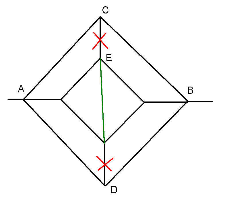 1) Правильно ли? 2) И как обосновать, то что в точках, которые я указал стрелками, мы можем соединить схему? (т.к. я руководствовался соображениями симметрии Затем попытался решить вашим, представленным выше методом и вот, что получается Поподробнее можно, если не сложно? -/-/-, в твоих рисунках разбираться непросто - бледно, и на первом рисунке плохо выбрана проекция, третий рисунок тоже неясен. Если хочешь, чтоб тебя поняли и ответили - пиши и рисуй подробнее и четче (типа совет). Это и послужило причиной задержки.. В целом, мне кажется, все верно. Относительно соединений: соединять можно точки с одинаковым потенциалом, если хочется. Ток все равно по новому проводу не потечет Твою задачу я бы представил так, наверное: Вообще, соображения симметрии - очень правильные соображения. Но с ними надо быть осторожным, так как легко обмануться. Четких правил, как 2х2, для проверки симметрии нету. Симметрии могут быть разными.. Эти соображения хорошо использовать как общее направление, подкрепляя более весомыми тезисами. Но иногда они настолько убедительны, что дополнительные соображения можно опустить. Вот смотри - я поставил красный крест на отрезке СЕ - почему его можно разорвать? Да, симметрия - но как именно? Разбираемся.. В точке С сходятся три провода. По Киркгоффу, сумма токов равна нулю. Но если по СЕ течет ток, то ток АС не равен току СВ. Но равенство токов АС и СВ уже слишком очевидно - не только из симметрии рисунка, но и из симметрии обратимости токов (поменять плюс с минусом). Так что на этом этапе можно остановиться и считать, что ток СЕ равен нулю. Дальше можно провести зеленое соединение, а также соединить точки С и D (как ты сделал) - но зачем? Задача и так уже распалась на последовательно-параллельные цепи.. Ну, а дорешивать первый вариант до конца.. Эх, в лом - абы как не хочется, а по-хорошему - много писанины.. Кажется, ответ там был R. Если все же очень надо - напиши, сделаю -------------------- я - ветер, я северный холодный ветер