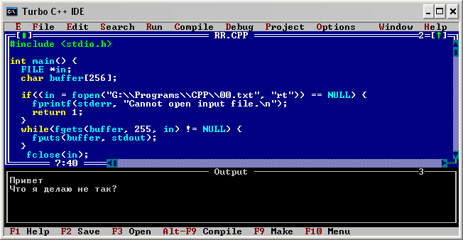 Как сделать в Turbo C русский язык. (Его нет, так как я вывожу инфо из файла, а получаю каляки маляки). Ту же самую каляку-маляку получаю и C++ Builder. Подскажите.