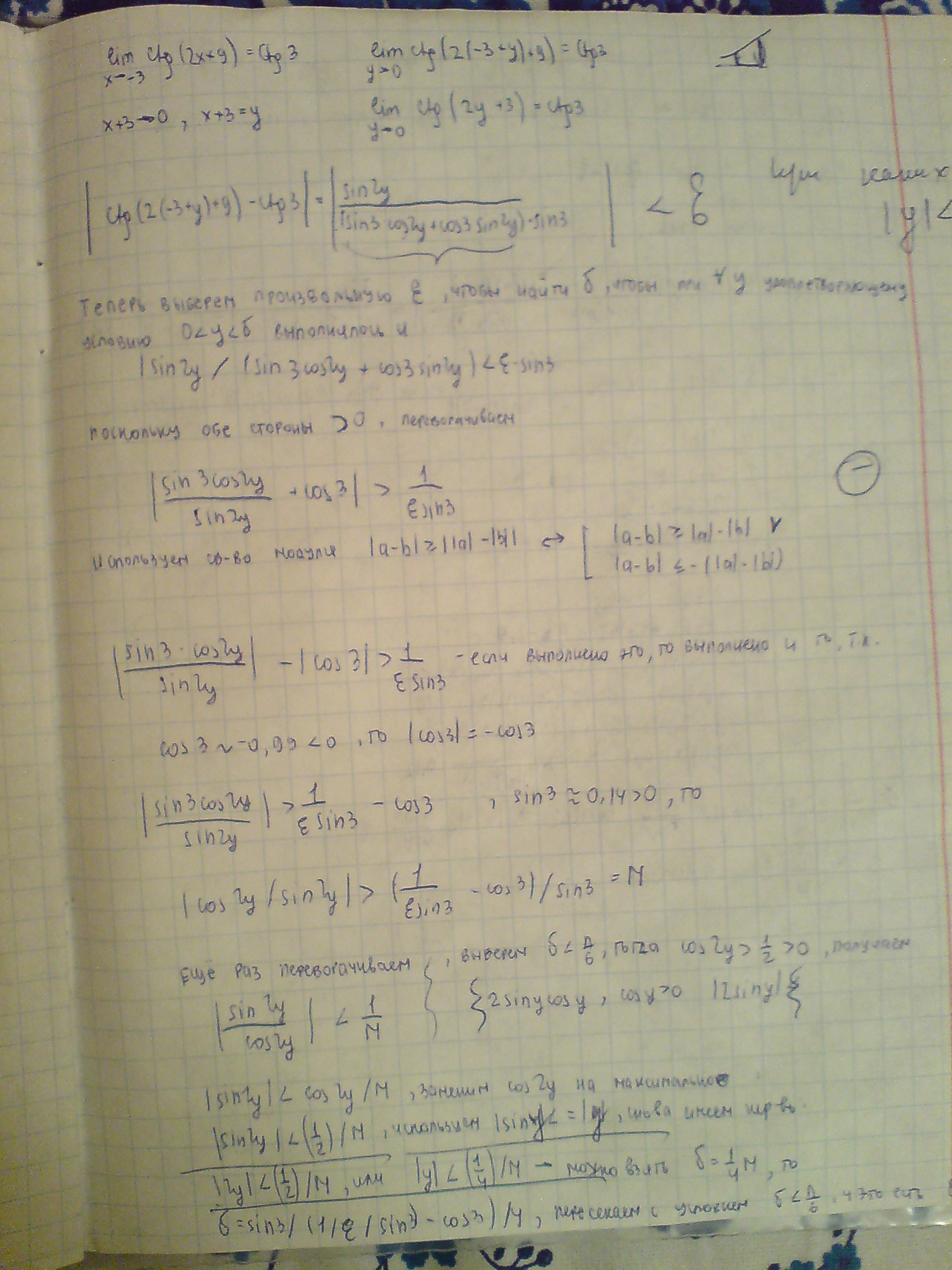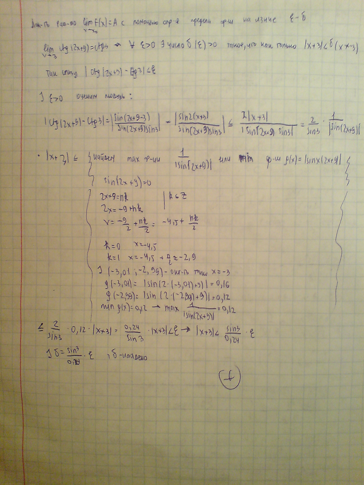 ![]() вот само задание. ![]() ![]() вот мое абсолютно неправильное решение) пример для предела: lim cos(2-3x)=cos1 при x-->1 ![]() ![]() а мне нужно решить для примера-- lim ctg(2x+9)=ctg3 при x-->-3 определение предела на языке эбсэлон-дельта: число А называется пределом(пределом справа,пределом слева) функции f в точке x0 принадлежащей множеству X, если для любого эбсэлон больше нуля существует дельта зависящее от эбселон и большее нуля такое,что для любого х удовлетворяющего неравенству (x0-дельта)<х<(х0 + дельта) выполняется неравенство модуль(f(x)-A)<эбсэлон |
