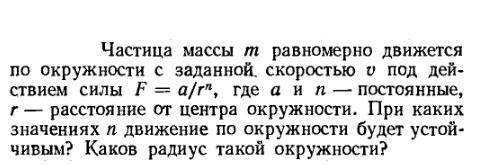 Цитата Короче, видимо, надо напревать на все противоречия со здравым смыслом, действительно взять силу равной m*w2/r сложить ее с данной в условии Как сложить? Они ведь взаимоперпендикулярные, или как? Как напрямлена сила с условия к m*w2/r ? Цитата потом проинтегрировать все по радиусу, чтоб найти потенциал ("как бы" потенциал)), потом найти условие на n, при котором этот потенциал имеет минимум хоть где-нибудь, ну и найти этот минимум. Вот и все, полагаю. При этом ответ разве получится в форме неравенства? Условие минимума искать производной? Но тогда зачем интегрировать? Цитата Условием устоичивости является минимум потенциальной энергии, а не отрицательность ее. Отрицательность-положительность вообще несущественна, хотя бы уже потому, что ПЭ определена с точностью до аддитивной константы. Откуда ты это взял, я так и не понял. С решения, нижняя часть. Нашел условие устойчивости в интернете, вы, безусловно, правы, но почему в том решении потенциальная энергия должна быть отрицательной? Это ошибка, да? |