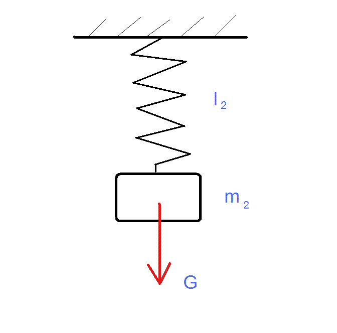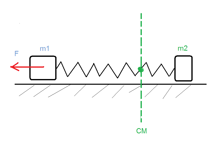 Спасибо за ответы Я сильно подозреваю, что это всего лишь форма вежливости, а не благодарность за помощь.. Хорошо, я разберу решение подробнее.Доказывать равность модулей ускорений не надо, уточнил у преподавателя Значит так.. У преподавателя ты можешь уточнять условие. Можешь уточнять и все остальное - но только для себя. Договорились? Весь наш разговор тут должен основываться только на понимании. Вопрос про равные ускорения я вообще выпустил из поля зрения, так как подумал, что твой уровень вполне достаточен (судя по предыдущим задачам), чтобы самому разобраться, что это бред. Силы ты знаешь, массы знаешь - все, значит и ускорения знаешь. При переходе в неинерциальную систему - добавь силы инерции. И сам делай выводы. И никогда не используй в физике довод "преподаватель так сказал". Договорились?Про другой вариант - я об этом: Цитата А нужна ли здесь энергия вообще? Все расписывается исключительно через импульсы. Ох.. Andriano, не надо бросать необдуманных реплик, ладно? Я не спорю, что тут "все расписывается исключительно через импульсы", но только если (цитирую первый твой мессадж) "составить систему дифференциальных уравнений, описывающих процесс, после чего думать, каким образом ее можно решить." Когда речь идет о положениях в потенциальным поле с известными значениями энергии, намного удобнее использовать... Мне продолжать? Тогда на основе чего и когда мы можем использовать то, что прирост к.э. равен нулю? Я не вполне понимаю, о чем ты. Твои заявления иногда похожи на некие прормежуточные рубежи, которые ты берешь, неизвестно откуда. Но могу сказать, что, например, в системе ЦМ движение является периодическим. В нем КЭ циклически переходит в ПЭ, и обратно. Это помогло?Теперь, когда на вопросы отвечено, давай перейдем к решению. Итак, система массы m=m1+m2 подвержена действию внешней силы F. Ускорение ЦМ равно: acm = F /m Переходим в СЦМ (система, связанная с ЦМ). Появляются силы инерции, соответственно на первое и второе тела: G1 = -acm*m1 G2 = -acm*m2 Полная сила на первое тело равна F+G1+Fупр , на второе: G2-Fупр - это я говорю только для того, чтоб ты представлял себе полную картину в СЦМ. Далее - очень важный момент, который я очень желаю тебе понять. Этот прием можно использовать в разных ситуациях, и я рад, что тут его можно продемонстрировать. Я уже писал о нем выше, но, похоже, ты не проникся. Будь внимателен, пожалуйста. Центр масс находится между первым и вторым грузом - то есть на пружине. Отметим его положение краской (зеленой). Теперь, если мы будем растягивать пружину (с грузами) так, чтобы ЦМ оставался на месте - зеленая точка будет оставаться на той же позиции, то есть по прежнему будет представлять ЦМ. Важно понять, что этот факт - не тривиальный, что он верен только для равномерной (с постоянным модулем Юнга по длине) пружины. Это важно понять, чтобы потом не ошибиться в применении подобного приема. Итак, если мы находимся в СЦМ, то зеленая точка стоит на месте. Но это еще не то, о чем я писал. Если мы теперь поставим неподвижную стену в положении зеленой точки (т.е. ЦМ), прикрепив к ней пружину, то эта стена совершенно не повлияет на ход процесса. Зеленая точка как была неподвижной, так и осталась. И вот теперь - самый важный шаг: обрежем пружину сразу за стенкой и уберем вторую часть, оставив конец первой части пружины прикрепленным к стене. Несмотря на то, что вторая часть