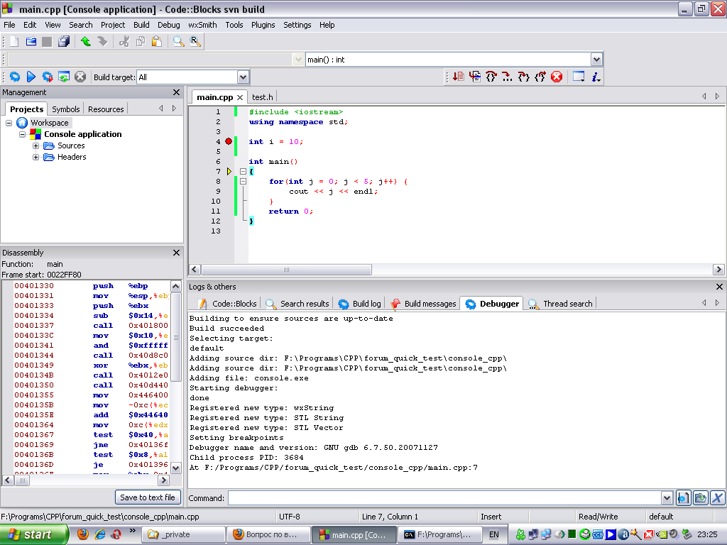 Цитата ставлю breakpoint перед объявление главной функции И чего ты хочешь от дебаггера? Выполнение программы начинается с main(), в любом случае должен получить что-то вроде:(т.е., дебаггер начнет работу с самого начала main). Содержимое вкладки Debugger - в студию. Если не получается - попробуй создать чистый проект, в нем - самую простую тестовую. программу, и запусти ее... Если и в новом проекте не выходит - то попробуй обновить на последнюю "ночную сборку" у меня nightly build от 21 июня 2009. |