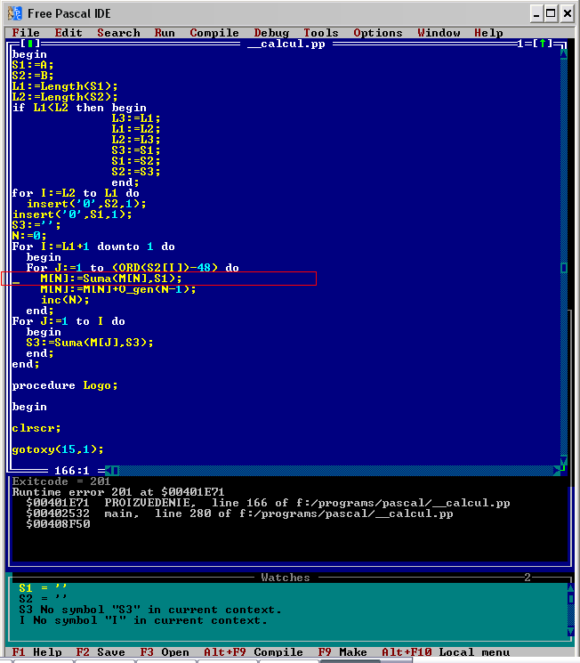 Цитата Но в реализации допустил ошибки, ибо функция Proizvedenie просто вылитает Во-первых:function O_gen(K:integer):string;, иначе у тебя получается что-то типа рекурсии. Не надо делать непереносимые вещи. А во-вторых, что, тебе FPC не сообщает, почему программа вылетает? Мне, например, сообщает: строка №166 выделена. Беглый просмотр дает ответ: при N = 0 - вылет за нижнюю границу массива. Отладчик для кого? Добавлено через 2 мин. P.S. Если ты думаешь, что тот цикл, в котором находится выделенная строка, отформатирован правильно - ты ошибаешься. Отформатируй, пока не поздно, как положено. Иначе будут проблемы... |