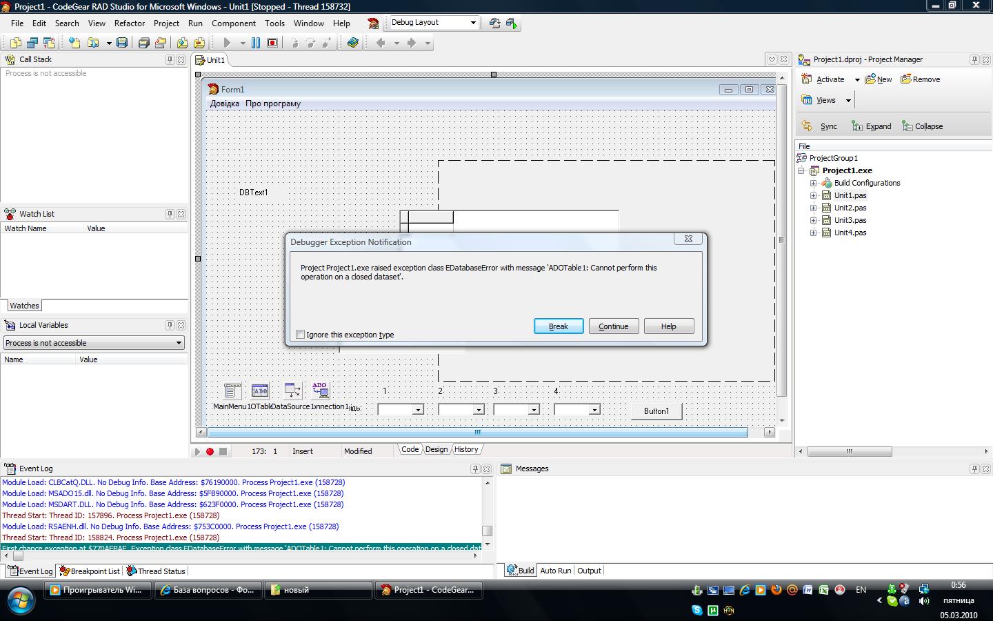 procedure NextQuestion; Без этой строки такая ошибка (на скрине) В моем проекте (для теста, база Access) данные DBText и DBEdit обновляются при перемещеним (и через датасурс и через AdoTable) Эскизы прикрепленных изображений |