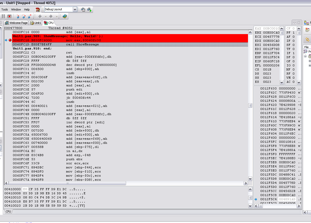 Создал простой прокет дельфи и хочу посмотреть этот код на асме. Как узнать какой код соответсвует определенному обработчику(Button1.click например). Как просмотреть содержимое регистров? Даже если не моя программа работает с ними? Это все к чему... |