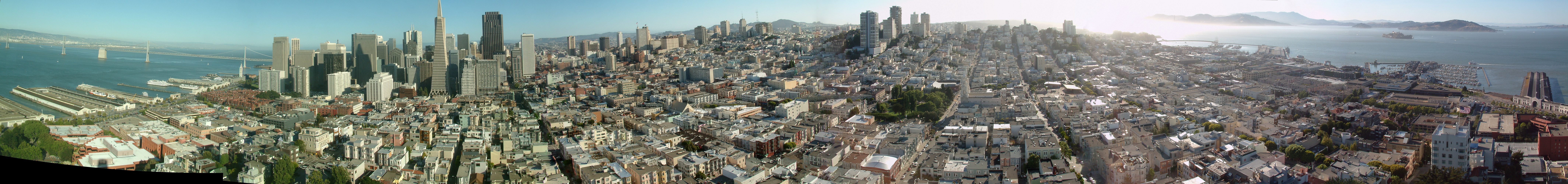Недавно я снова заинтересовался панорамами. И вспомнил, что я снимал их немало, но не склеивал. Софт для этого был сырой, я не смог найти достаточно эффективного способа тогда (вручную уходили часы). А сейчас - нет проблем! Так что я полез в свои архивы и стал искать сырье )). Если уважаемая публика заинтересуется, то могу показать и готовый продукт. Начинаю с очень древней композиции. На ней - один из моих любимых городов. Сан-Франциско, обалденный и неповторимый. Увы, снимал я как-то криво и косо. Может даже я и не имел в виду составлять из этого панораму, но все же 7 кадров удалось состыковать. Угол охвата получился около 180о (хотя, я уверен, с того места можно было взять полный круг). Качество, честно скажу - дрянь.. Зачем тогда показываю? а что - это же не выставка, правда? Это форум Слева - знаменитый Bay Bridge, за ним идет центр города (Downtown), потом вид на холм и - как раз на месте засвеченного пятна должен был быть еще более знаменитый Golden Bridge (Золотой мост).. Увы и ах, он так блистал, что ослепил мою камеру напрочь.. (шутка, он на самом деле красный и неблестящий)). Короче - смотрите.. Еще раз спасибо volvo за вывод меня из заблуждения (+1); этот файл весит 1.88 MB. Оригинал почти в два раза больше по разрешению и сильно лучше по качествы (хотя все равно далеко не то, что хочется), он весит 15 мег. Необрезанная панорама тянет 22 мега.. -------------------- я - ветер, я северный холодный ветер