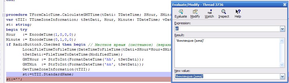 Внимание, вопрос: А что тебе возвращает GetTimeZoneInformation в поле StandardName, можно посмотреть? Сделай просто вот так: и прилепи сюда картинку... не-а.... не то она возвращает... но всё, вопрос вроде закрыт... сделал через "LocalFileTimeToFileTime" (Kernel32.lib)... там на скриншоте виден код... надо только ещё проверить учитывает ли она этот DYNAMIC_TIME_ZONE_INFORMATION, а так всё работает... |