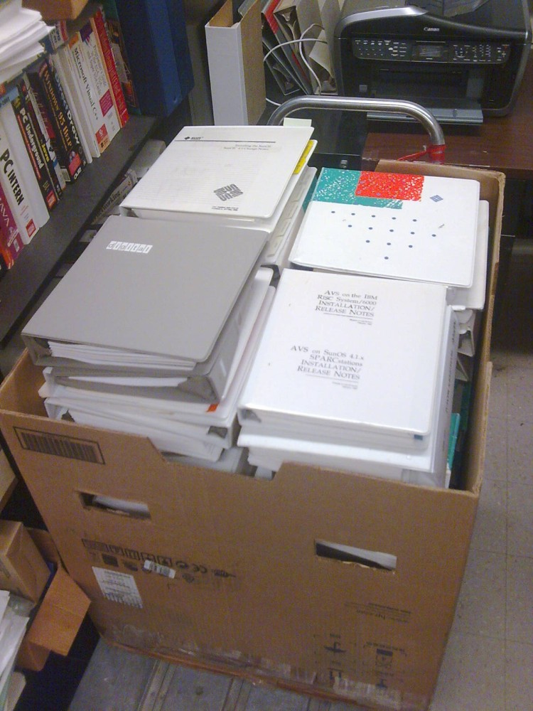 гарантийные талоны тоже автомат оформляет?) Тут нет такого понятия вообще. Иногда могут спросить чек, подтверждающий покупку (особенно, если требуется возврат денег), но могут и не спросить. Если покупаешь на кредитку (как в этом случае), то всегда можно взять в банке подтверждение.ЧНФ не видел, а сам делал. Как говорится, "почувствуй себя инквизитором". Выгружал страрые книги (в основном - документация на хард и софт) из шкафов и свозил их на помойку.. Лет -дцать назад я б за любую из них душу продал.. Раньше стиль был не как сейчас, к каждой дискете прилагалось несколько томов )). SUN, SG, DEC, IBM, HP, CA... Это только самая первая порция, потом было еще несколько )). Все байндеры увеличенных размеров, сложены в гигантскую коробку из-под старого ТВ. -------------------- я - ветер, я северный холодный ветер