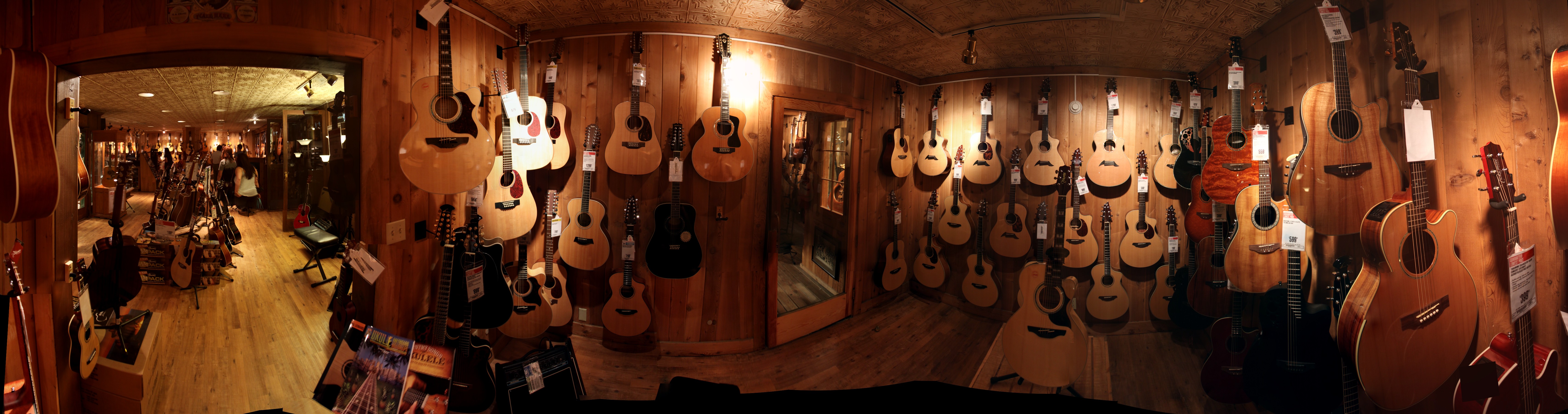 Наконец, добрался до дому и могу выложить свое ЧНФ. Вторая панорама из Гитар-Центра. Она сделана в маленькой комнате, которую и залом назвать трудно. Их там несколько, и это очень удобно, потому что между ними - закрывающиеся двери (стеклянные), звукоизоляция вполне на уровне, и можно сесть и поиграть на любой понравившейся гитаре - как, собсно, все и делают. На этот раз я кладу И панорамный снимок, И ссылку на HD-view страницу - так что вы можете сравнить преимущества этих двух способов представления.