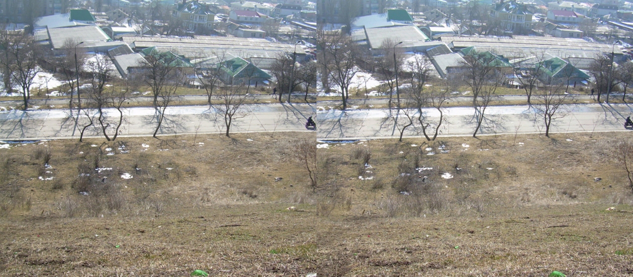 вид с холмика (задний план правда унылый... Так. Rian, давай, колись уже - как снимал? У тебя две камеры? снимаешь двумя руками или с помощником? как тебе удалось снять оба кадра в один момент? А вид с холмика Rian'a не получилось совместить почему-то Да потому что он упрямо не хочет пользоваться нормальным софтом! Та прога (ссылка где-то выше..) выравнивает и рамку, и поворот.. Смотреть становится значительно проще! Мне-то все равно (и Rian'у, наверное, тоже), я хоть Тадж-Махал с Нотр-Дамом сведу глазами и пожонглирую - но о других-то надо же подумать! totally, если не в лом - скачай прогу, разрежь эту картинку и сведи ее нормально (там есть кнопочка auto-alignment) и выложи тут, пусть Rian'у станет стыыыыыдно.. -------------------- я - ветер, я северный холодный ветер