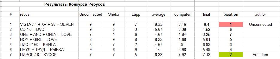 Маэстро, туш! Я все же урвал полчаса (на самом деле, больше часа со всеми проверками) и подвел итоги конкурса века Вот они: Некоторые пояснения. После самих ребусов идут столбцы с оценками от каждого человека (включая меня, хехе)). Затем столбец средних оценок от людей. Следующий столбец - оценка программы (подробности в файле в посте IUnknown выше), нормированная на максимум 9. Эти две оценки участвовали наравне, оценка final является их средним. По filnal определялось распределение мест. Уважаемая публика! Я имею честь объявить победителей! Ими стали: Unconnected - 1 место!! Freedom - 2 место! Поздравлем! Я жду сообщений в личку с адресом, куда высылать призы (прошу отнестись серьезно). Что еще сказать? Хочу извиниться за все задержки. Возможно, они как раз и обусловили не очень высокую активность, так что за нее я виню только себя. Но все же считаю конкурс удавшимся )). И надеюсь, что следующий (еще пока не знаю какой - есть идеи?) пройдет еще лучше!! Добавлено через 4 мин. PS Конкурс закончен - но его обсуждение можно продолжать! Кто хочет лично высказать поздравления? обсудить систему оценок? просто поболтать на эту тему? )) и еще: IUnknown получает +1 за предоставление оценочной проги и собственно проведение оценки. Спасибо! -------------------- я - ветер, я северный холодный ветер