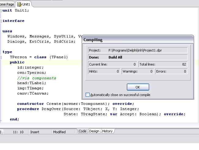 очень даже известная, компилируется без вопросов... Цитата а где я буду писать обратчик OnDragOver? Обработчик события - это не метод. Ты в классе реализуешь метод DragOver. Создаешь компонент. Пользователь хочет работать с Drag-n-Drop. Его устраивает от функционал, который ты заложил в компонент - ничего не надо делать, все работает по умолчанию (при наступлении события). Не устраивает - он дабл-кликает на нужное событие, и пишет обработчик OnDragOver...Еще раз: не путай метод и событие. Когда наступает событие. Когда наступает событие OnSomething выстреливается метод Something. Вот тебе пример. Знаешь, что такое Interceptor-класс, да? Это тот класс, который пишется перед классом формы для "открытия" каких-то частных или защищенных свойств/методов. Очень частая практика. Вот смотри: unit Unit1;И теперь, не назначая никаких обработчиков событий OnClick, ничего вообще не делаем, сразу запускаем код на выполнение и жмем кнопку. Что произошло? Ага!!! Событие OnClick наступило, и сработал метод Click... Чувствуешь разницу? |