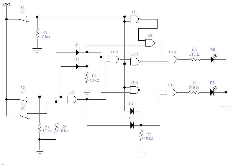 Вот набросок схемы, реализующей указанную логику. Ко входам подключены тумблеры, выходы нагружены на светодиоды (D5 - "внешний ключ", D6 - "выходной проводок"). Схема реализована только на ТТЛ 2И-НЕ элементах. Предлагается использовать микросхемы 7400, 155ЛА3, 555ЛА3 и т. п. Благодаря использованию диодного ИЛИ удалось сократить количество ИС до двух (по 4 логических элемента в каждой). Не берусь гадать, что это, но если станет известно назначение схемы, возможно ее удастся упростить (данный вариант использует исключительно"цифровой" подход).