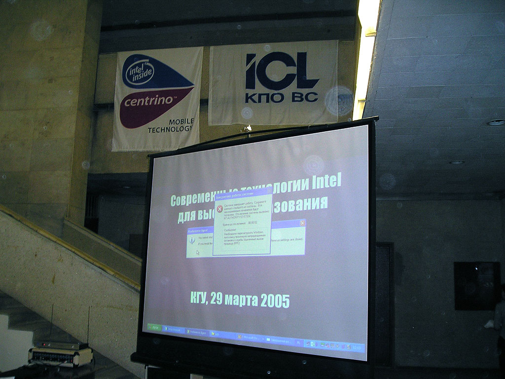 Сегодня в КГУ прошла акция посвященная беспроводным технологиям представленная компаниями Inteд® и ICL. Что я ожидал от этого мероприятия.. хотелось посмотреть на технологию IEEE 802.11n, беспроводные мультимедиа фишки на подобие конфернт-связей. Хотел чтобы они меня чем-то удивили. И ведь им это удалось, хотя не совсем в том смысле: Поставив нулячие ноуты без какой-либо защиты и заплаток они хотели чтобы все работало. Не прошло и часа как пара компьютеров заполучила msblast. Что же сделали наши мудрые администраторы? Они отключили сеть (или же она сама вырубилась?). Стали ставить сервис пак 2. Позабыв при этом что msblast уже сидит в системе больше нет, они хотели продемонстрировать презентацию "Технологии Intel". Что последовало далее можно заметить на скриншоте... Еще пара нюансов: «Беспроводные технологии Intel» Девушка споткнулась о кабель: — Осторожнее! Вы нам щас сеть угробите. «Презентация Технологий Intel совместно с компьютерами RAYbook». На самом деле основной ноут был другой маркировки — IBM. Хотите cерийный номер windows XP Home или Professional? Их есть у меня!© Достаточно посмотреть на системный блок одного из компьютеров, где наклеена вся эта информация. Пришел, увидел, сфоткал и ушел. "Wi-Fi технологии поддерживают устойчивую связь на большом расстоянии». Верно особенно если учесть что скорость была в районе 10 mb/s вместо обещанных 54-х. И это на расстоянии 5-10 метров от роутера. Пришел на это мероприятие не с пустыми руками, а со своим бейджем от AMD. Отдал поносить друзьям, один из них учавствовал в конкурсе, выйграл, но призов не получил. Потому что AMD. Было очень даже весело, обязательно посещу данное мероприятие в Мае. Верю что будет лучше. -- С уважением, Эскизы прикрепленных изображений -------------------- |
