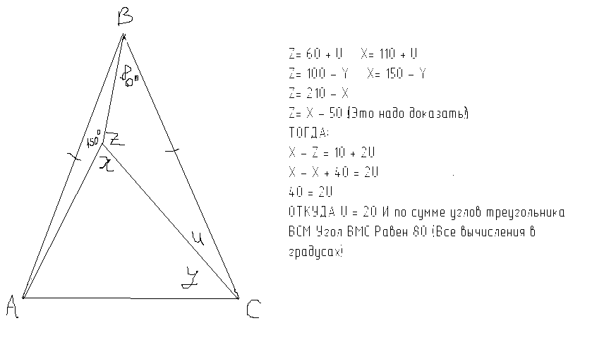 В равнобедренном треугольнике АВС угол В=100 градусам. Внутри треугольника взята точка М так, сто угол МАВ =10 градусам, а угол МВА=20 градусам. Найти угол ВМС.