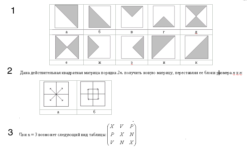 Сейчас решаю вот такие задачи, сам пока еще не сделал, но думаю вы мне поможете. Заранее благодарен за ответы. Задачи: 1. Дана действительная квадратная матрица порядка п. найти наибольшее из значений элементов, расположенных в заштрихованной области матрицы. (см. присодиненное изображение) 2. Дана действительная квадратная матрица порядка 2п. получить новую матрицу, переставляя ее блоки размера п х п: (см. рисунок) 3. Имеется таблица Т результатов некоторого шахматного турнира, в котором участвовало n (n>2) шахматистов: T: array [1..n, 1..n] of (V, N, P, X), где T[i, j] = V, если i-ый участник выиграл у j-го ( при этом T[j, i] = P), T[i, j] = N, если i-ый и j-ый участники сыграли вничью. В противном случае T[i, j] = Х. При n = 3 возможет следующий вид таблицы: (см. рисунок) За выигрыш дается 1 очко, за ничью – 0,5 очка, за проигрыш – 0 очков. Вывести номера участников в порядке невозрастания набранных ими очков. Однотипные задачи объединены... Сообщение отредактировано: volvo - 13.05.2005 9:02 Эскизы прикрепленных изображений |