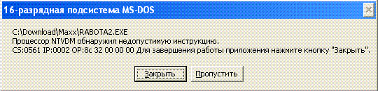 Только напоследок вопрос: при запуске вылазиет ошибка NTVDM, 16 -разрядная система MS-DOS и тд и тп...Окошко ошибки в прикрепленном файле. Как с этим бороться? -------------------- - Дорогие девушки! У вас сухая кожа? Редкие волосы? Проблемы с фигурой? Приходите к нам! У нас темно и мы пьяные.