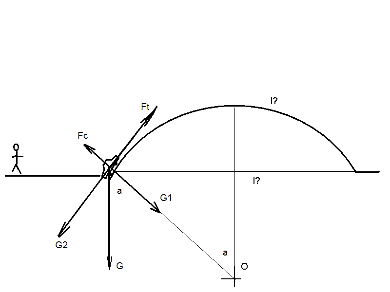 Сначала разберемся с углом a. Я не знаю, что имелось в виду под длиной моста - расстояние от берега до берега или реальная длина дуги. В первом случае будет a=arcsin(l/(2R)), а во втором a=l/(2R). Выберите, что кому нравится. Баланс сил изображен на картинке. G=mg - сила тяжести, она разложена на нормальную составляющую G1 и прараллельную поверхности, G2. Далее, я счел удобным перейти в систему координат, вращающуюся вокруг точки O вместе с авто. В этой системе появляется центробежная сила Fc. Ну и несчастная сила трения, которая одна тянет весь этот воз вверх. Для того, чтобы это у нее получалось, надо соблюсти условие: Ft=G2. Максимальная сила трения равна прижимающей силе, умноженной на коэффициент трения. Прижимающая сила равна разности G1-Fc, а Fc=V^2/R. Таким образом, получаем: (g*cos(a) - V^2/R)*k = g*sin(a) Это и есть основное уравнение, которое нужно решить относительно V. Что касается опасности прыжка во второй части моста... кажется, я ее переоценил. Силы те же самые. Если был прижим в первой половине, то он будет и во второй Еще раз прощу прощения за неверное понимание условия сначала.. Эскизы прикрепленных изображений -------------------- я - ветер, я северный холодный ветер
