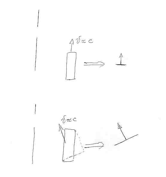 вот... при даже незначительном изменении изменении угла направления скорости, его проекция на плоскость перпендикулярную направлению движения(при учете значительной действительной длинны стержня) будет быстро увеличиваться, как это показано на рисунке, из чего следует, что стержень не сможет пройти сквозь отверстие, не задев его... |
