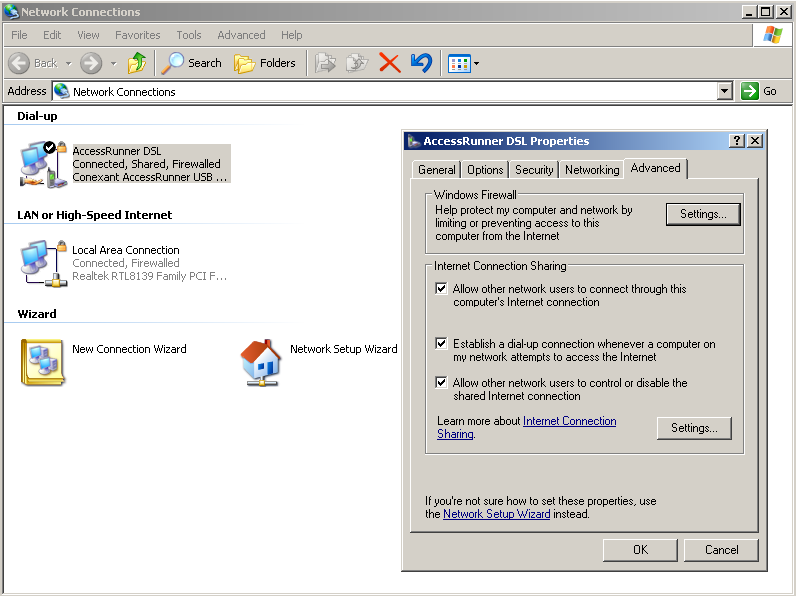 У меня дома сеть следующего вида: Т.е. 2 компьютера шлюз и рабочий. К шлюзовому подключен USB ADSL модем. Раньше все было ок, после того как на шлюзе завелся вирус, временно отключил его и включил на его место другой компьютер. Настройки на шлюзе. Есть 2 соединения 1. Локальная сеть ИП: 10.0.0.1 маска 255.255.255.0 2. Подключение АДСЛ оно сделанно общим. Вот скрин: Настройки на рабочем компьютере Соединение локальная сеть ИП: 10.0.0.75 Шлюз 10.0.0.1 Маска 255.255.255.0 Провел мастера настройки сети на обоих компах. На серваке указал в мастере что комп имеет прямое подключение к Интернет. На рабочем компе указал что используется шлюз. (причем мастер нашел расшаренное подключение на шлюзе). Домена конечно нет, рабочая группа одна и та-же. НО! На рабочем компе никто упорно сеть видеть не хочет Ну почемуууууу? -------------------- Помогая друг другу, мы справимся с любыми трудностями!