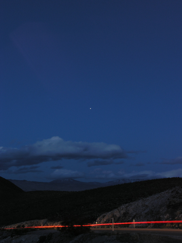 Где это? Это Angelos National Forest, но это не суть важно. Следующее фото из Долины Смерти. (точнее, с подъездов к ней). Вскоре после заката. Венера, должно быть.. Я снимал, не надеясь на успех - был жуткий ветер, штатив вырывало из рук. Я спратался за машиной - не помогло. Принес коврики с пола, укрылся ими.. Все равно получилось немного смазано.. Выдержка 15 секунд. Мне нравится подчеркивающая полоса от фонарей проехавшей мимо машины.. Почти никаких корркций, кроме четкости. -------------------- я - ветер, я северный холодный ветер