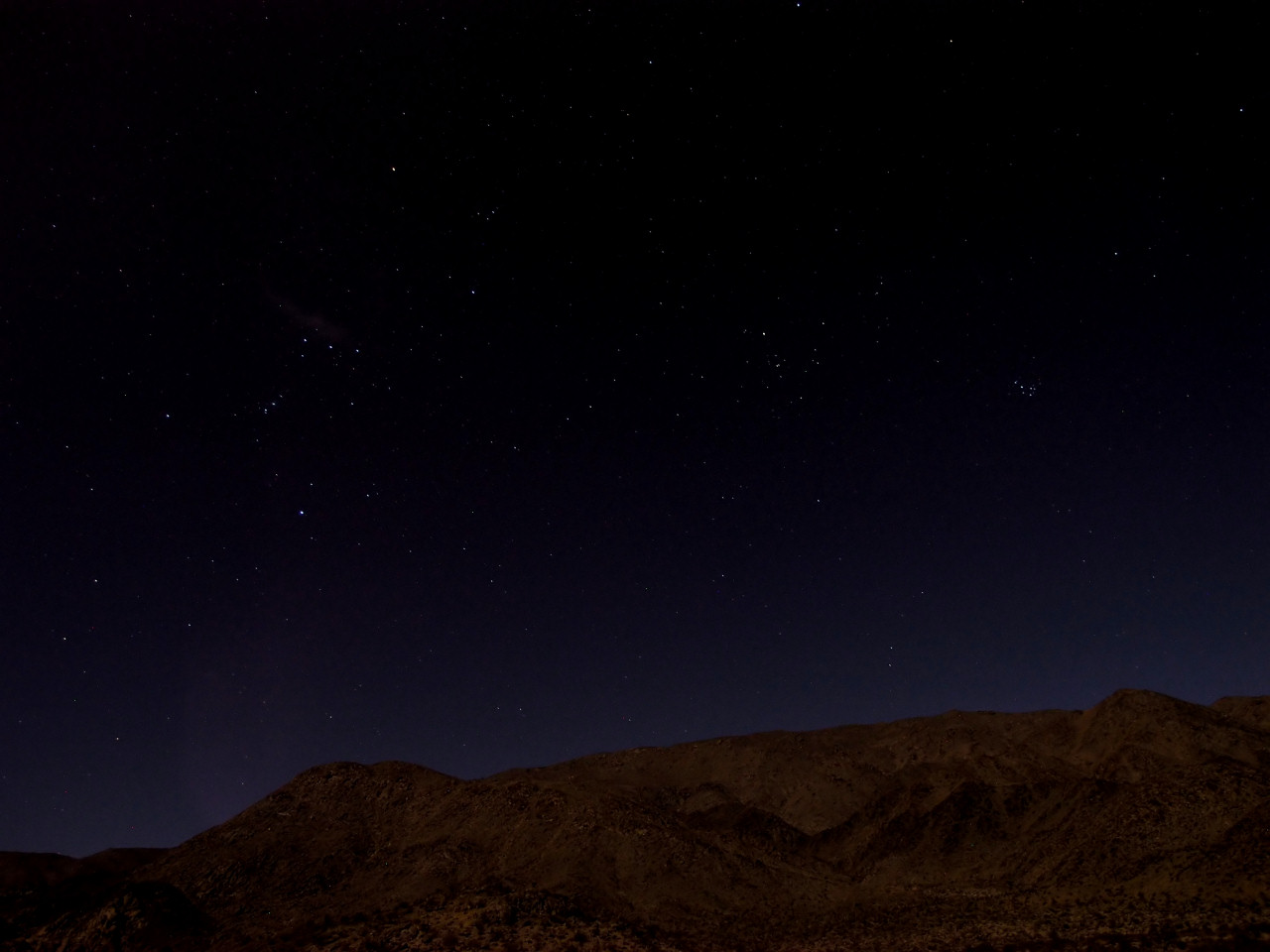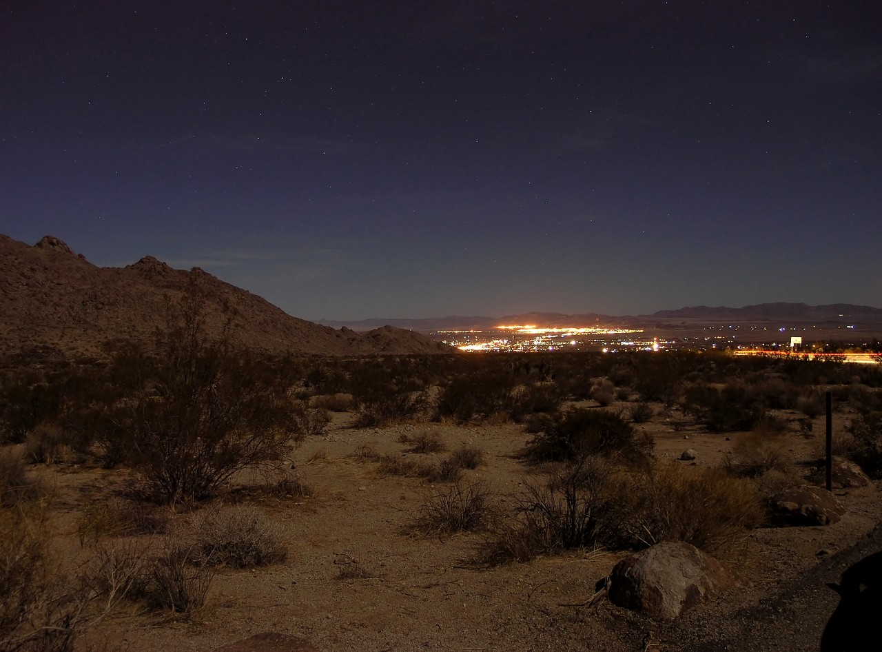 Снято примерно в девять вечера 4 марта. Как я узнал позже, буквально за несколько часов перед этим было лунное затмение. Соответственно, сейчас Луна полная. Направление снимка - примерно на Запад. Небольшая подсветка над горой - видимо, еще от солнца. Очень хорошо виден Орион, Телец и Плеяды. Это уменьшенная копия, а на оригинале звезд больше, чем я видел невооруженным глазом. А это вид на Север. Огни принадлежат городу Двадцать-Девять-Пальм - это поближе, а за ним яркое облако огней - это специальная база для тренировок морпеха. На небе видно, вроде бы Кассиопею.. Этот привычный кусок неба тут так низко, что на этом фото узнаю его с трудом. Обратите внимание, как все хорошо освещено луной Экспозиция: 15 сек при 2.8. Баланс белого выставлял на "солнце за облаками". Чувствительность: 100 ISO Место съемки: вблизи въезда в национальный парк Joshua Trees. В центре ссылки видно небольшая парковка, с которой я снимал, а также ворота въезда в JT (чуть ниже). Боюсь ошибиться относительно высоты над уровнем моря - думаю, около полкилометра. Оба снимка обработаны: убран шум, немного добавлен контраст (10), второй довернут на 1.5 градуса. -------------------- я - ветер, я северный холодный ветер