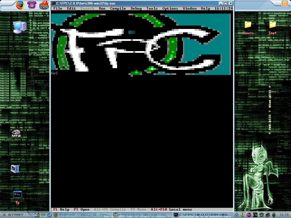Открывается он только в оконом режиме. Курсором мыши не могу открыть не вкладку File, не Edit, не Run, вообще никакую. Открываются эти вкладки только сочитанием клавиш (Alt+F открывает вкладку File и т.д.). Можно ли сделать полноэкранный режим. Платформа под Вин. Ось - win2k. Для ясности выложил скриншот. Сообщение отредактировано: Orlangur - 19.11.2005 17:44 Эскизы прикрепленных изображений |