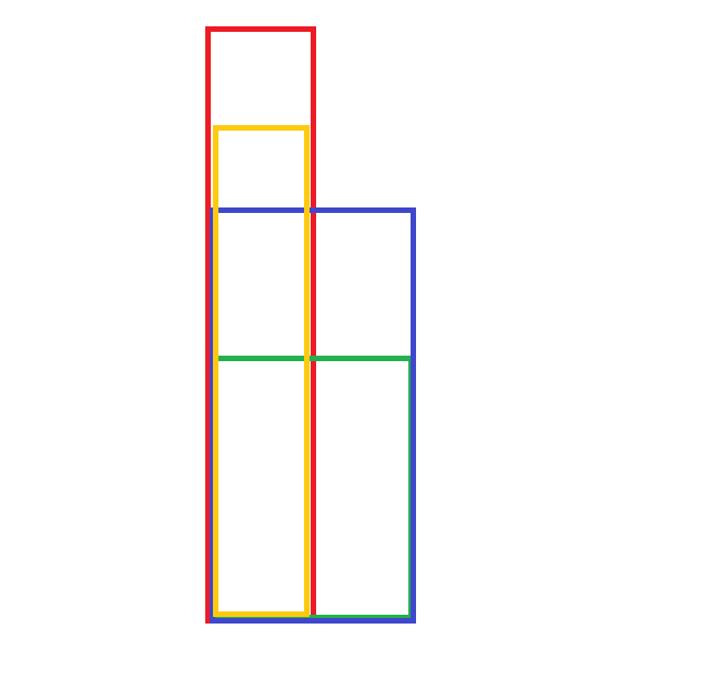 Есть слитки (максимальный размер уже отброшен) красный 1 х 8 желтый 6 х 1 зеленый 2 х 3 синий 5 х 2 Сначала поворачиваем их так, чтоб первое число было не больше второго: красный 1 х 8 желтый 1 х 6 зеленый 2 х 3 синий 2 х 5 Нарисуем их так, чтоб левый нижний угол совпал: Из рисунка ясно, что желтый заведомо пролезет в ту дырку, в которую пролез красный, и та же самая ситуация с зеленым и синим (для опредлелния этого как раз и нужна упорядоченость x<=y). Значит, желтый и зеленый можно выкинуть из нашего списка и не заботиться о них совсем. Остаются красный и синий: Вопрос: что выгоднее - сделать отдельную дырку для каждого (по его размерам) или же одну большую дырку (я дополнил тонкой линией), в которую пролезут оба? Ответ на этот вопрос зависит от соотношения площадей розовой (двойная польза) и голубой (бесполезная площадь) частей дырки. Если голубая меньше розовой, то - да, выгодно. Если наоборот - невыгодно. Если равны - все равно )). Но этот вопрос (как и ответ на него) чисто для удовлетворения любознательности. Для решения перебором это все не нужно. Просто обсчитываешь оба случая и сравниваешь результаты. Все )). -------------------- я - ветер, я северный холодный ветер