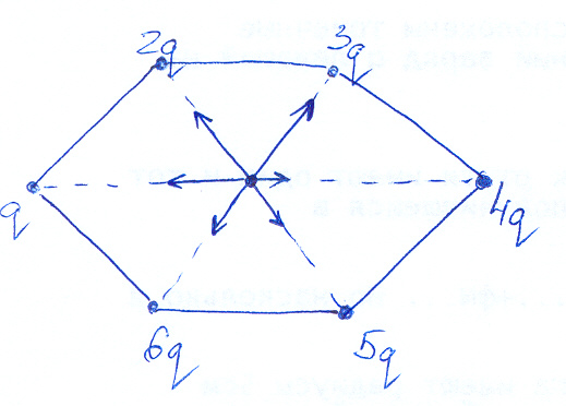 1-4, 2-5, 3-6. Теперь представим их так: 1-(1+3), 2-(2+3, 3-(3+3) Идея в том, что действие меньшего заряда в каждой такой паре уравновешивается действием части (равной малому заряду) большого. Значит, их можно взаимно уничтожить. В результате останутся только три заряда в трех соседних углах, причем все они равны 3q. Сумма сил от двух крайних зарядов в этой тройке в точности равна действию одного среднего заряда (следует из векторной суммы, учитывая, что все треугольники равностороннние). Следовательно, искомая сила равна силе, производимой зарядом, сосредоточенным в одной точке (а именно в той, где заряд 5q) и равного 6q. Во второй задаче я не совсем тебя понял.. Ты не упомянул сохранение полного заряда, что является ключевым. Выражаешь заряд маленькой капли через потенциал и радиус маленькой капли, умножаешь его на N, потом находишь радиус большой капли (через сохранение полного объема, это правильно) и находишь потенциал большой капли через полный заряд и радиус большой капли. Ну и желательно оговорить, что изначально капли далеко друг от друга.. Третья задача не совсем корректна на мой взгляд, так как какой бы тонкой ни была проволока, она все равно существенно изменит картину поля и расчет потенциала по формуле для шара будет неверным. Но все же, решение, видимо, такое - другого придумать сейчас не могу.. -------------------- я - ветер, я северный холодный ветер