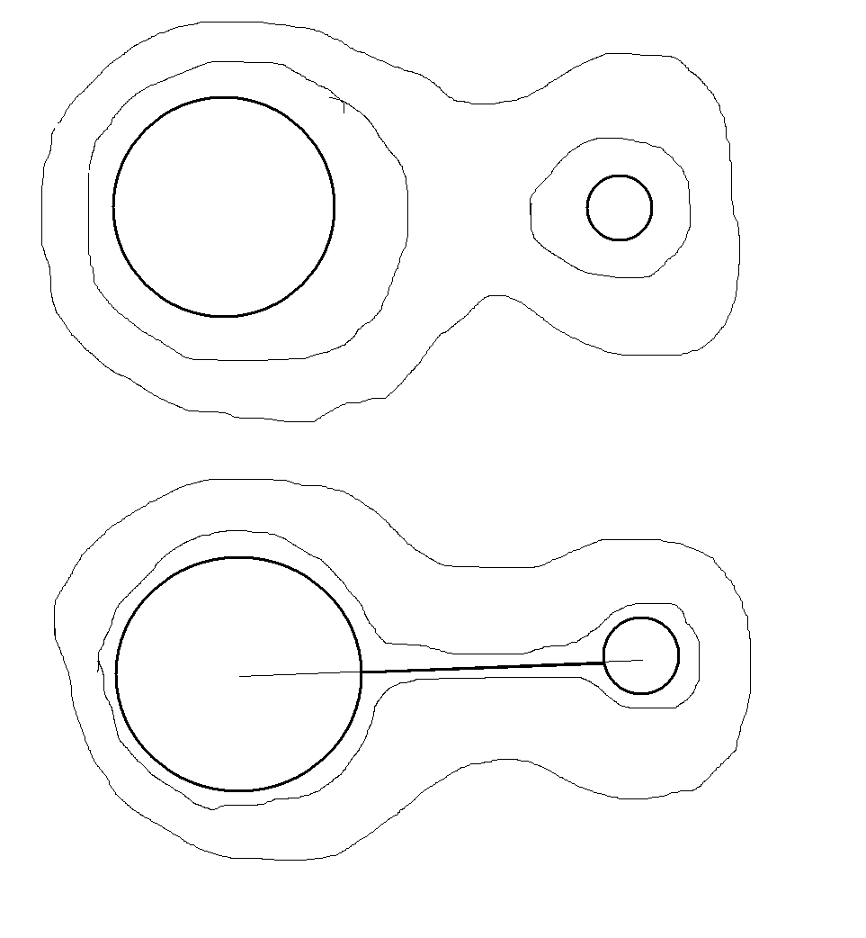 [b]По поводу третьей, думаю можно обьяснить так: проводник насколько тонкий, что его электроемкостью можно пренебречь => зарядом на нем тоже можно пренебречь. Или так нельзя Я имел в виду следующее: картины поля вокруг системы из двух шаров без проволоки (то есть таких, для которых работают формулы потенциала) и с проволокой между ними довольно разные (см рисунок). Близкие к поверхностям шаров эквипотенциали в первом случае представляют собой почти круги - или по крайней мере два отдельных замкнутых контура, а во втором случае все - как далекие от поверхности так и близкие к ней эквипотенциали имеют форму гантели. Я не могу сказать на вскидку, чем это может грозить, но думаю, что "очень тонкого" провода в этом смысле не существует - даже провод нудевой толщины внесет подобные искажения. Конечно, его можно потом убрать, но для этого его нужно разомкнуть, чем прекратить переток зарядов, и конечный заряд может все же быть не таким, как для двух эквипотенциальных сфер.. Точнее сказать сейчас не могу, подумаю еще. -------------------- я - ветер, я северный холодный ветер