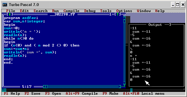 но работает частично например если вводить последовательность чисел -1,-3,-5,-7,-9,-11 проспускаются -5 и -7 ой убрал последний readln и все заработало зы теперь буду думать над циклом с for Сообщение отредактировано: Hunt666 - 12.11.2006 23:58 |