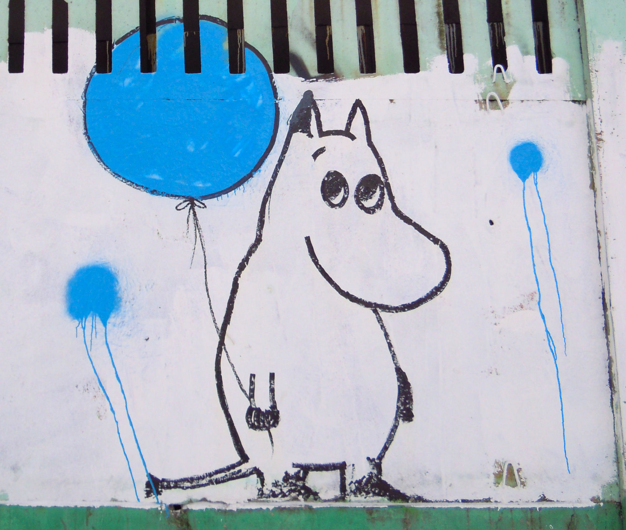 (интересно, прикрепится картинка или нет?..) Я была поражена в самое сердце. Это так нехарактерно для московских заборов. К тому же это не просто здоровенный Муми-Тролль идет в гости к Пятачку и несет ему синий воздушный шарик, а с ним идут еще два мрачных живых существа, маскирующиеся под синие воздушные шарики! Замечаете: на картинке ветер дует в двух (противоположных) направлениях... |