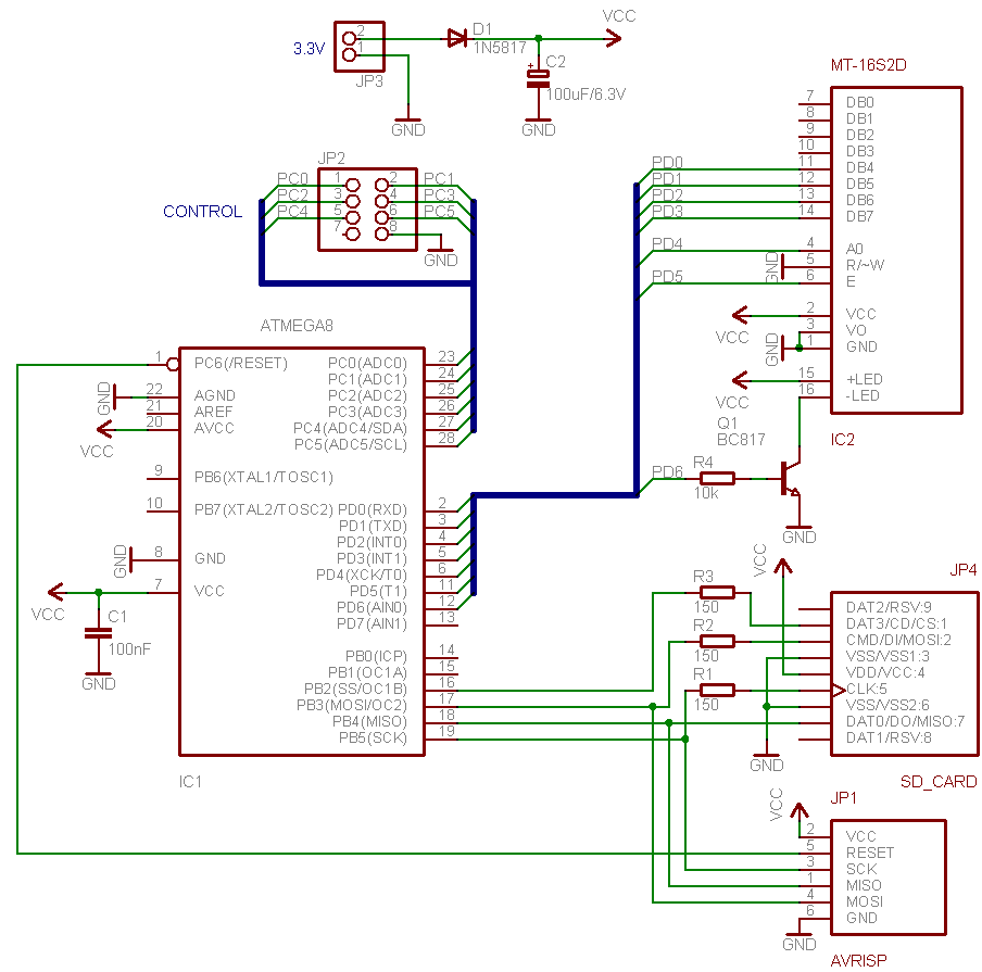 ![]() Выводы МК, обозначенные как PBx, PDx, PCx (порты) являются пользовательскими - их функции задаются прошивкой контроллера (firmware). Порт C используется для подключения клавиатуры - через разъём JP2. Порт D управляет LCD. Порт B используется как последовательный интерфейс для обмена данными с картой памяти, а также для программирования самого МК. IC2 - ЖК дисплей - представляет собой модуль MT-16S2D от МЭЛТ, который объединяет в себе ЖК панель 80 x 16 точек, управляющий контроллер и светодиодную подсветку. Управление подсветкой осуществляется через ключ на транзисторе Q1. ![]() ![]() JP4 - слот карты памяти. Выходные сигналы от МК к карте защищены от короткого замыкания резисторами R1-R3. JP1 - разъём для программирования МК - стандартный, 6-контактный, для программатора AVRISP или аналогичных (в простейшем случае - LPT порт и несколько резисторов). ![]() Питание 3.3В поступает с разъёма JP3 через защитный диод D1 (если перепутают полярность питания) на блокирующий конденсатор C2 и далее ко всем остальным узлам схемы. Питающая линия ("+" питания) обозначается как VCC (common-collector voltage), общий провод ("-" питания) - как GND (ground). Блокировка питания конденсаторами C1 и С2 нужна для: - подавления импульсных помех по питанию; - уменьшения сопротивления источника питания по переменному току (в идеале оно должно быть нулевым), что также способствует более устойчивой работе питаемых компонент. -------------------- The idiots are winning.