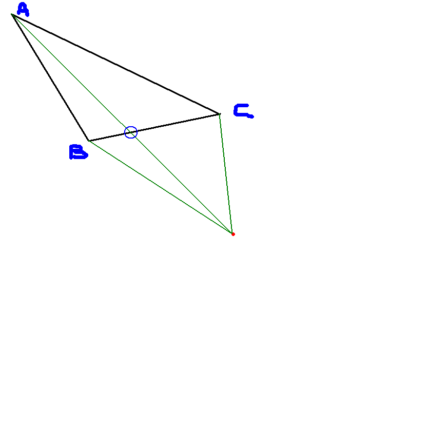 Дан треугольник, заданный координатами своих вершин и точка находящаяся _вне_ треугольника. Верно ли утверждение что хотябы для одной из вершин треугольника, прямая, построенная через нее (вершину) и данную _внешнюю_ точку не будет иметь точек пересечения ни с одной из сторон треугольника (сама вершина, принадлежащая 2-м сторонам не считается). На рисунке таких вершин 2: B и C, а вершина A пересекает отрезок BC спасибо. Если это не верно, нарисуйте пожалуйста Сообщение отредактировано: klem4 - 20.07.2007 20:39 -------------------- perl -e 'print for (map{chr(hex)}("4861707079204E6577205965617221"=~/(.{2})/g)), "\n";'