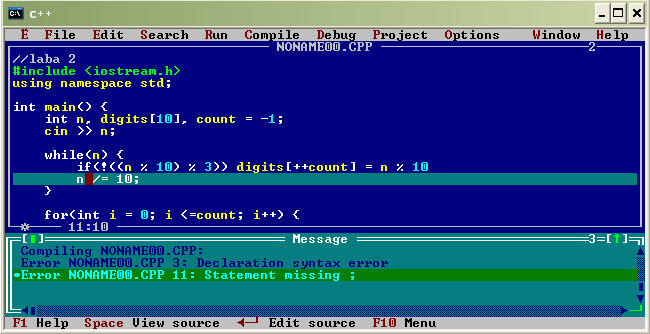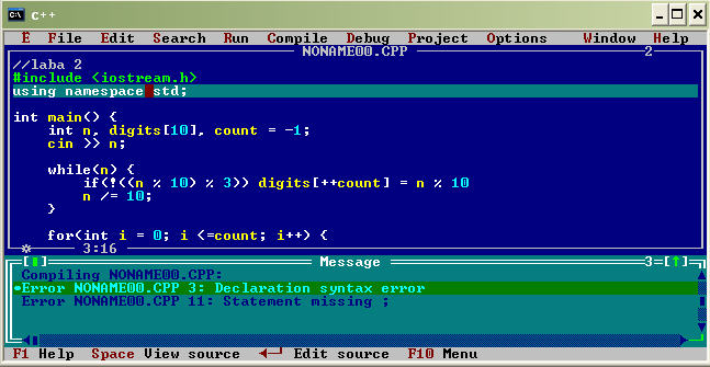 Ну, если у тебя старый ДОСовский компилятор, то просто убери строку using namespace std;, тогда будет компилироваться... Я смотрю, ты уже изменил имя файла на iostream.h ... А насчет второй ошибки - ты забыл точку с запятой; заметь, в моем посте она есть... извините. я просто ещё оч плохо в си++ разбираюсь,а точка с запятой-моя глупая ошибка. спасибо! |