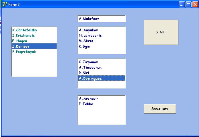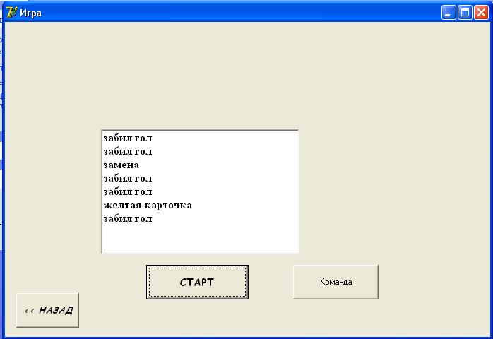 В этой процедуре я конечно нагородил... Идея такая: пока случайно выбираются события матча из массива massev и выводятся в Листбокс. Нужно сделать чтобы события в него выводились с некоторой задержкой, и чтобы матч можно было остановить, что-то сделать с составом и возобновить, не теряя предыдущих событий. Если пользователь сделал замену игрока, соответственно выводим сообщение об этом в Листбокс. P.S Как лучше выводить таблицу? Да, обновленная версия, если нужно: Сообщение отредактировано: cooler - 15.04.2008 20:16 Прикрепленные файлы